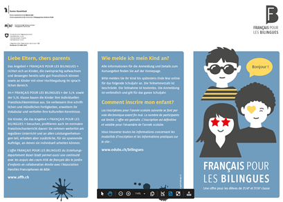 Der Informationsflyer bewirbt das Atelier-Angebot «Français pour les bilingues». Er ist in deutscher und französischer Sprache abgefasst und richtet sich sowohl an die Kinder als auch an ihre Eltern.