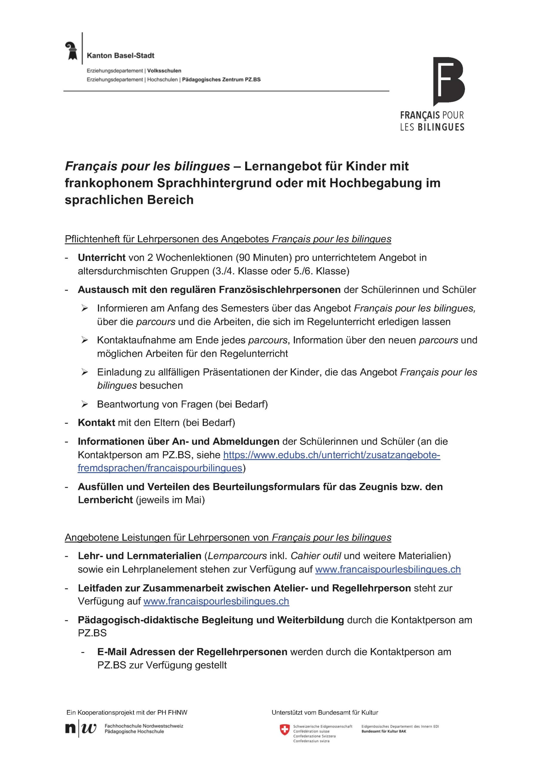 Das Pflichtenheft hält die Aufgaben der Lehrpersonen in den Atelier-Angeboten «Français pour les bilingues» fest.